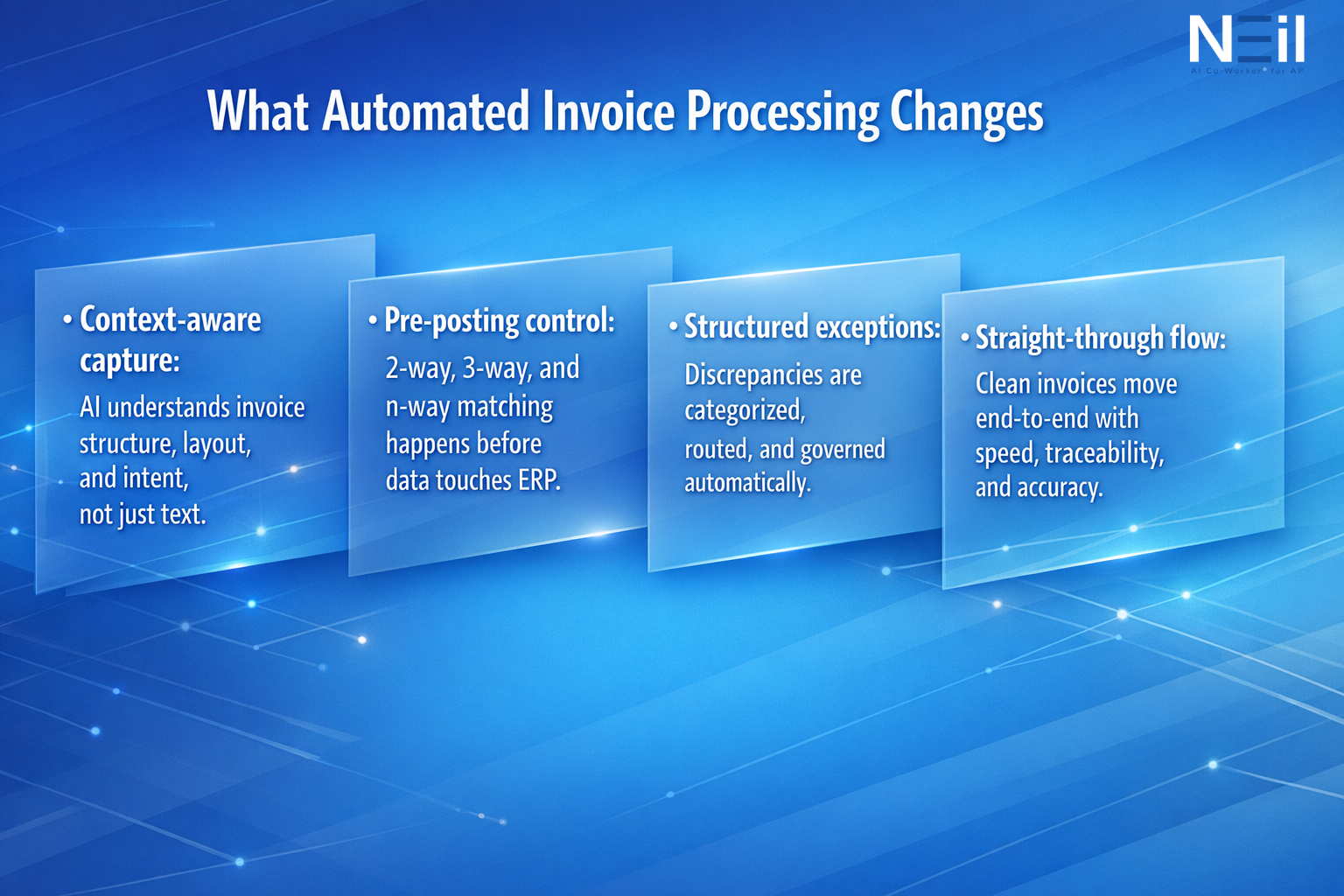 Neil analyzes captured documents to identify and extract relevant fields. Unlike template-based systems requiring configuration for each vendor format, Neil uses machine learning to recognize fields across unlimited invoice variations. It validates extracted data against purchase orders and goods receipts already in the ERP system, checking for discrepancies and flagging mismatches for review.